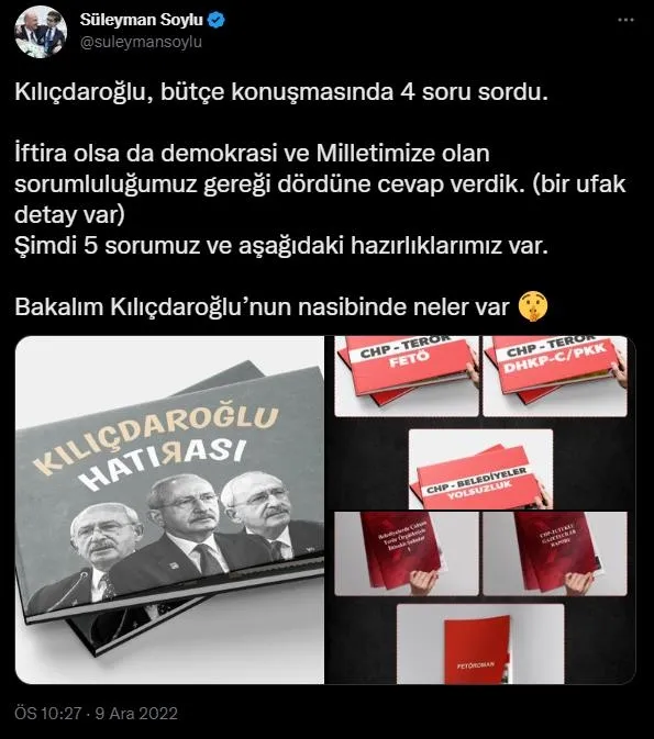 Kılıçdaroğlu'nun fotoğraflarının yer aldığı albüm şeklindeki tweeti paylaşan Soylu, "Kılıçdaroğlu, bütçe konuşmasında 4 soru sordu. İftira olsa da demokrasi ve Milletimize olan sorumluluğumuz gereği dördüne cevap verdik. (bir ufak detay var) Şimdi 5 sorumuz ve aşağıdaki hazırlıklarımız var. Bakalım Kılıçdaroğlu'nun nasibinde neler var" ifadelerini kullandı.