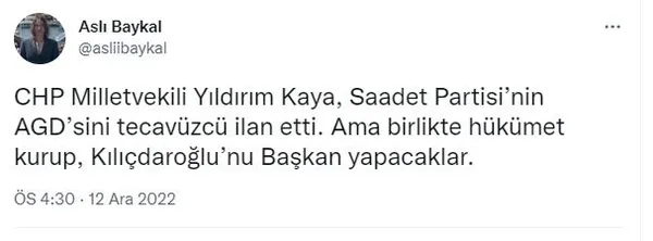 Öte yandan Baykal, CHP'li Yıldırım Kaya'nın Saadet Partisi'nin AGD'sini tecavüzcü ilan ettiğini açıkladı. Baykal Twitter hesabından "Ama birlikte hükümet kurup, Kılıçdaroğlu'nu Başkan yapacaklar" diye yazdı.