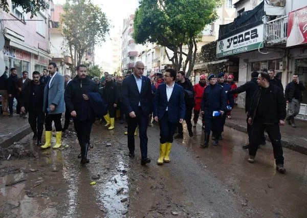 İçişleri Bakanı Süleyman Soylu, Kültür ve Turizm Bakanı Mehmet Nuri Ersoy ile Tarım ve Orman Bakanı Vahit Kirişci, Kumluca ilçe merkezinde selden etkilenen bölgelerde incelemelerini sürdürüyor.