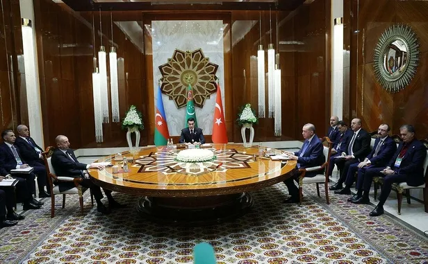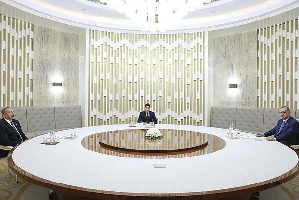 Başkan Erdoğan, yaptığı ikili görüşmelerin ardından, Azerbaycan Cumhurbaşkanı İlham Aliyev ve Türkmenistan Devlet Başkanı Serdar Berdimuhamedov ile liderler toplantısında bir araya geldi.