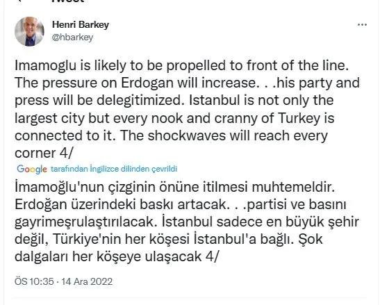 CIA etki ve saha ajanı Henry Barkey, "İmamoğlu'nun mahkum edilmesinden sonra bugün iki büyük kaybeden Erdoğan ve cumhurbaşkanlığı için ortak aday olacağını sanan CHP lideri Kemal Kılıçdaroğlu. İmamoğlu'nun çizginin önüne itilmesi muhtemeldir" açıklamasını yaptı.