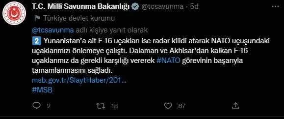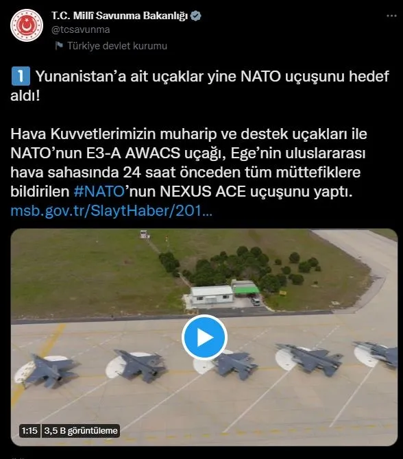 "Yunanistan uçakları, bir kez daha NATO uçuşunu önlemeye çalıştı, Hava Kuvvetlerimiz gerekli karşılığı verdi. Paket kol, Ege'nin uluslararası hava sahasında uçuşuna devam ederken, Yunanistan'a ait 5 ayrı hava üssünden kaldırılan F-16'lar uçaklarımıza radar kilidi atmak suretiyle taciz etti."