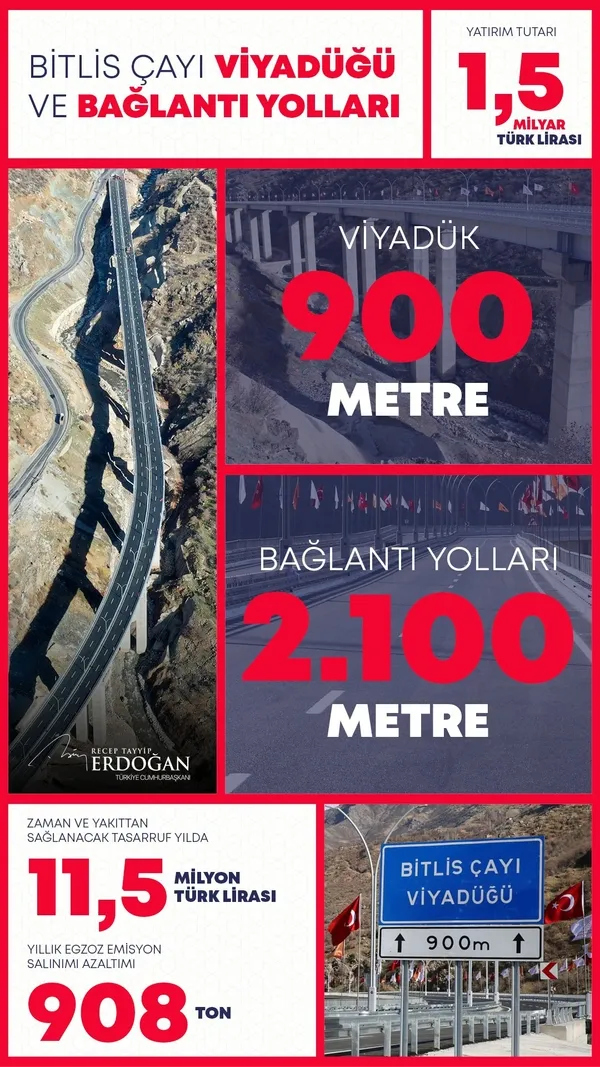 Bitlis-Diyarbakır kara yolunun daha güvenli hale getirilmesi, olumsuz hava koşulları nedeniyle ulaşımda aksamaların yaşanmaması amacıyla inşa edilen 900 metre uzunluğundaki viyadük, Başkan Erdoğan tarafından hizmete alındı.