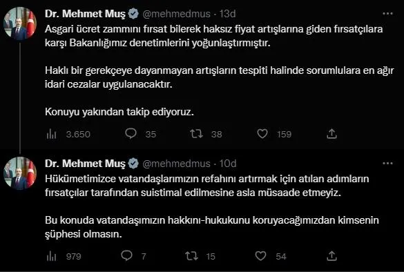 Konuya sosyal medya hesabından tepki gösteren Ticaret Bakanı Mehmet Muş, "Haklı bir gerekçeye dayanmayan artışların tespiti halinde sorumlulara en ağır idari cezalar uygulanacaktır." dedi.