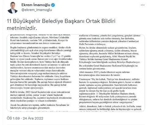 Ekrem İmamoğlu ve Mansur Yavaş'ın da imzaladığı ortak deklarasyonda CHP Genel Başkanı Kemal Kılıçdaroğlu'nun adaylığına destek verildi.