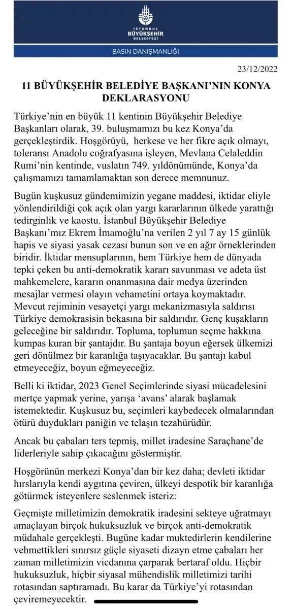 Gelişmeler sonrası bir araya gelen CHP'li 11 büyükşehir belediye başkanı, Konya'da toplantı yaptı. Toplantının açılış konuşmasını; CHP Genel Başkan Yardımcısı Seyit Torun ve İstanbul Büyükşehir Belediye Başkanı Ekrem İmamoğlu yaptı. Toplantının ardından CHP'li belediye başkanlarının ortak imzasıyla bir bildiri yayımlandı.