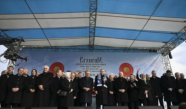 Erdoğan, Erzurum yeni miting alanında, Gürcükapı Kentsel Dönüşüm Projesi, İspir-Rize İl Sınırı Yolu ve Çat Afet Konutları ile yapımı tamamlanan diğer projelerin toplu açılış törenine katıldı.