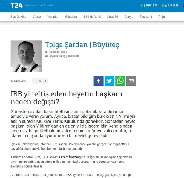Raporun teslim edilmesinin ardından köşeye sıkışan CHP'li İBB için fondaş medya algı operasyonuna başladı. Sözde bağımsız T24 yazarı Tolga Şardan "İBB'yi teftiş eden heyetin başkanı neden değişti?" başlıklı yazısında müffettişin görevden bilerek alındığını ima etti.
