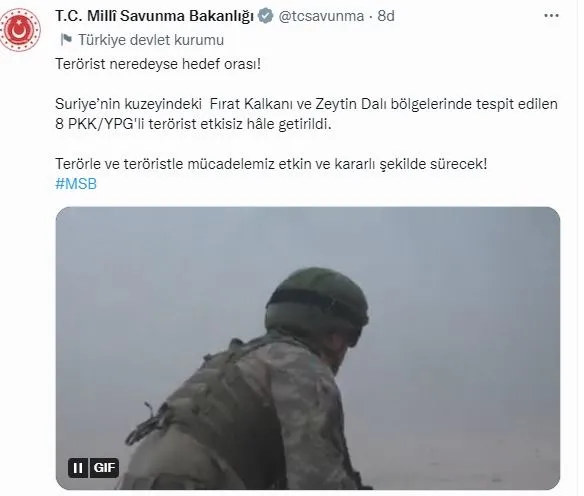 Bakanlıktan yapılan açıklamada, "Terörist neredeyse hedef orası. Suriye'nin kuzeyindeki Fırat Kalkanı ve Zeytin Dalı bölgelerinde tespit edilen 8 PKK/YPG'li terörist etkisiz hale getirildi. Terörle ve teröristle mücadelemiz etkin ve kararlı şekilde sürecek." ifadeleri kullanıldı.