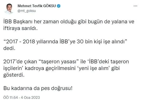 'İBB'deki taşeron işçilerin' kadroya geçirilmesini, İmamoğlu'nun 'Yeni bir işe alım' gibi gösterdiğini ve algı yapmaya çalıştığını aktaran Göksu, "İBB Başkanı her zaman olduğu gibi bugün de yalana ve iftiraya sarıldı" dedi.