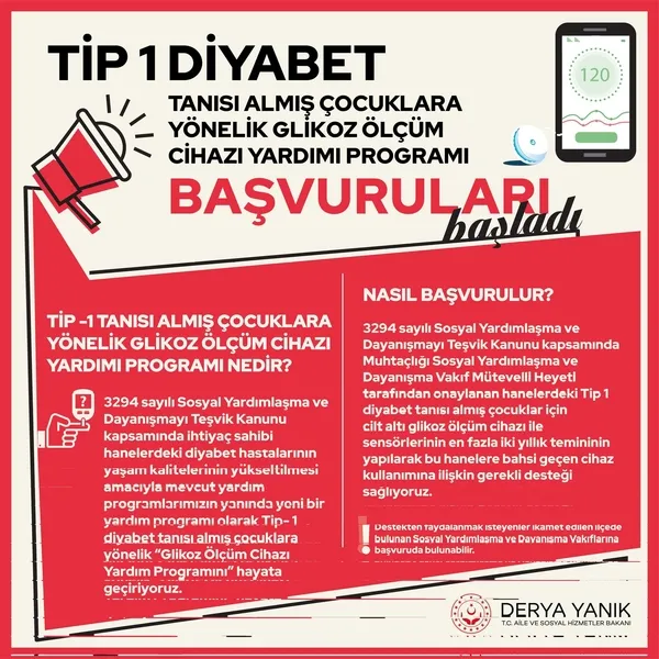 Aile ve Sosyal Hizmetler Bakanı Derya Yanık, sosyal yardım faydalanıcısı hanelerdeki TİP-1 diyabet tanısı almış çocuklara yönelik şeker ölçüm cihazı yardımında, başvuruların başladığını açıkladı.