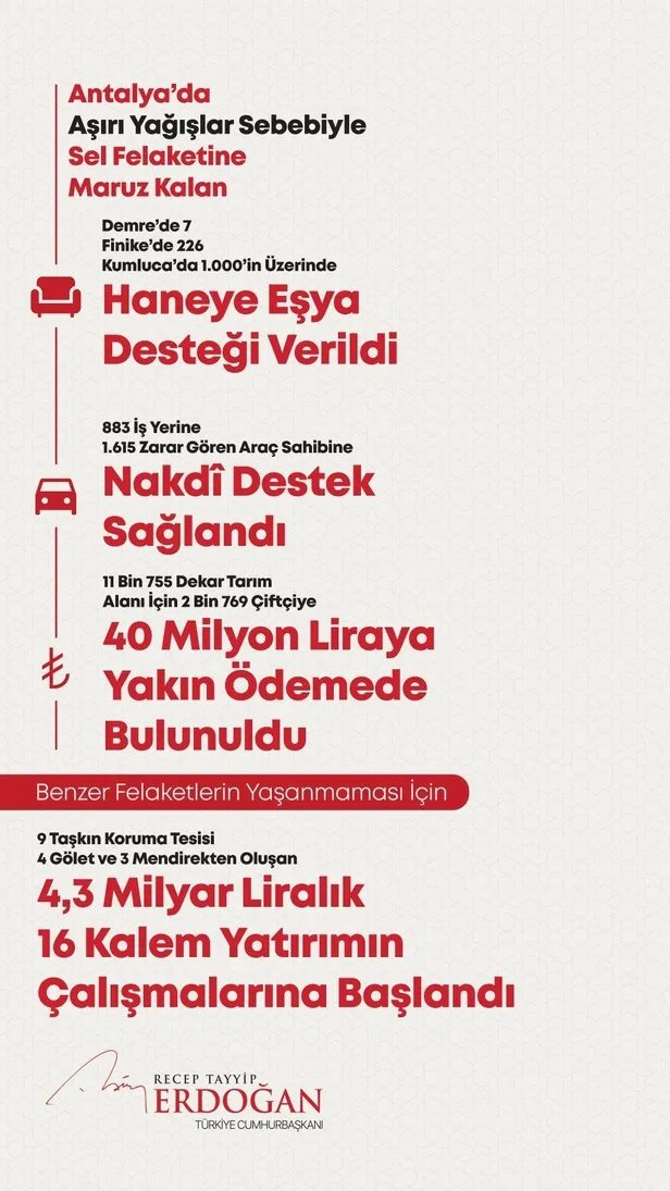 Sel felaketiyle ilgili sosyal medya hesabından açıklamalarda bulunan Başkan Erdoğan, "Geçtiğimiz ay sel felaketine maruz kalan Antalya'mızın Kumluca, Finike ve Demre ilçelerindeki vatandaşlarımıza bir kez daha geçmiş olsun dileklerimi iletiyorum."