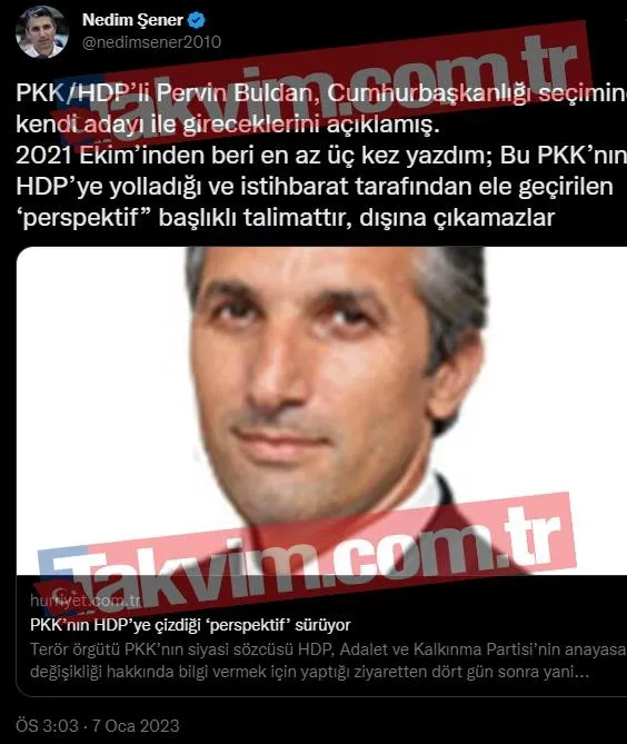 Benzer bir yazı kaleme alan Hürriyet yazarı Nedim Şener ise, gelen açıklamalar sonrası sosyal medyadan 9 Kasım 2022'de kaleme aldığı yazıyı paylaşarak, "PKK/HDP'li Pervin Buldan, Cumhurbaşkanlığı seçimine kendi adayı ile gireceklerini açıklamış. 2021 Ekim'inden beri en az üç kez yazdım; Bu PKK'nın HDP'ye yolladığı ve istihbarat tarafından ele geçirilen 'perspektif" başlıklı talimattır, dışına çıkamazlar" ifadelerini kullandı.