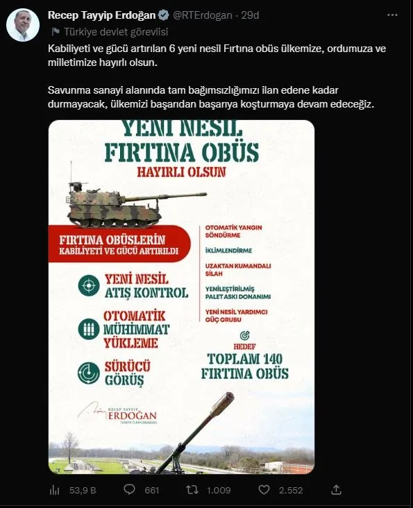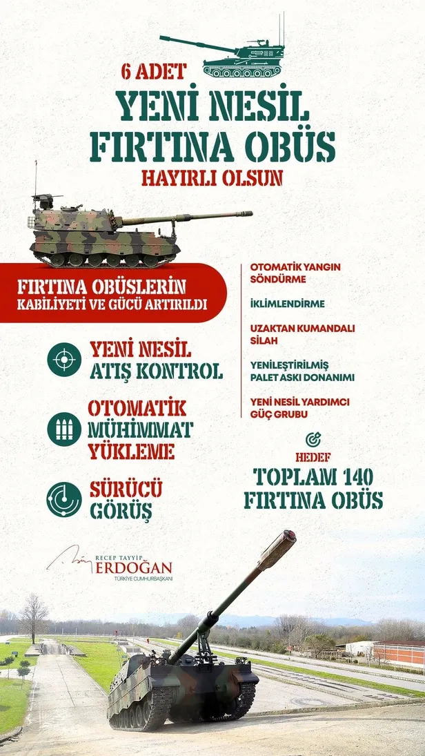 Sosyal medya hesabından Yeni Nesil Fırtına Obüslerinin özelliklerinin bulunduğu bir infografik paylaşan Başkan Erdoğan, "Kabiliyeti ve gücü artırılan 6 yeni nesil Fırtına obüs ülkemize, ordumuza ve milletimize hayırlı olsun. Savunma sanayi alanında tam bağımsızlığımızı ilan edene kadar durmayacak, ülkemizi başarıdan başarıya koşturmaya devam edeceğiz." ifadelerini kullandı.