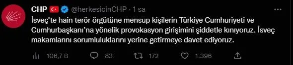 CHP, İsveç'in başkenti Stockholm'de, terör örgütü PKK/YPG destekçilerinin provokasyonlarını kınadı.