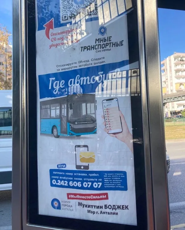 Tabelalarla Rusça otobüs hareket saatleri, belediyeye ulaşılabilecek numaralar ve mobil uygulama bilgilerine yer verildi. Ayrıca, Antalya Büyükşehir Belediyesi Başkanı Muhittin Böcek'in isminin de Rus alfabesi ile yazıldığı görüldü.