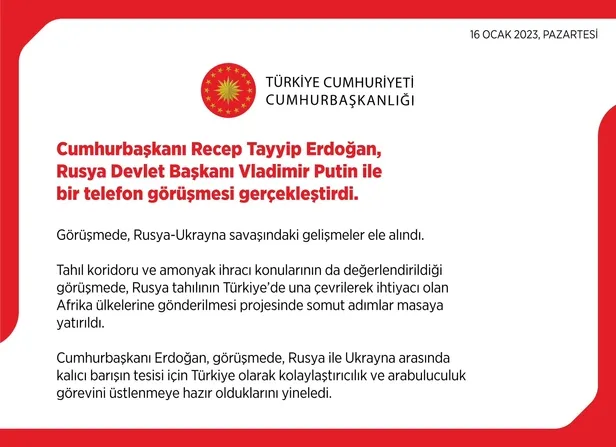Cumhurbaşkanı Erdoğan'ın 5 Ocak tarihinde Rusya Devlet Başkanı Putin ile telefon görüşmesinde enerji, Türkiye-Rusya ilişkileri ile Rusya-Ukrayna savaşı ve Suriye dahil bölgesel konular ele alınmıştı.
