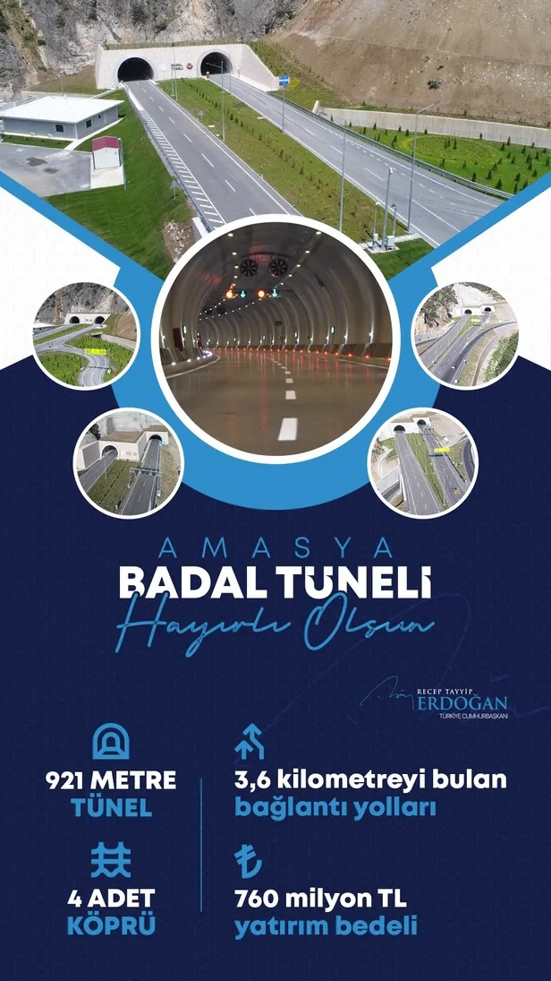 Kuzey hattının Amasya geçişinde yol standardının artırılması amacıyla hizmete sunulan Badal Tüneli'yle keskin virajlarla geçilen apik arazi yapısına sahip kesimde tünelli geçiş imkanı tesis edildi.