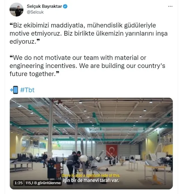 "Bu ekibi öyle parayla maddiyatla veya mühendislik güdüleri ile motive edemezsiniz ki. Biz ülkemizin yarınlarını inşa ediyoruz. Tam bağımsız yarınlarını inşa ediyoruz. Milletimizin faydasına bu işi yapıyoruz diyerek ancak bu işe motive edebilirsiniz. Zaten insanlarda bu inançla motive olup Baykar'da sabahlara kadar çalışıyorlar. Yoksa başka yerlere de gidebilirler. Çok daha yüksek maaş veren yurtdışındaki firmalarda da kendilerine yer bulabilirler ama mesela böyle bir şey görmüyoruz. Çünkü oraya gittiğinde çok daha önemli bir şey kaybedecek. Bu manevi motivasyonunu kaybedecek.