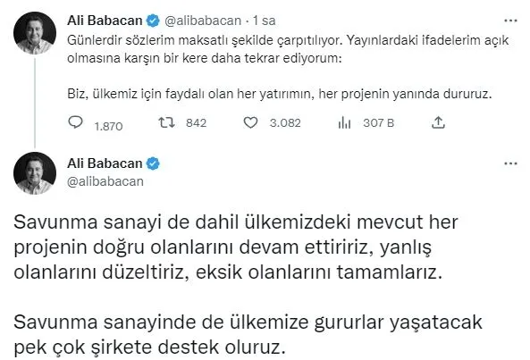 Babacan, açıklamalarının çarpıtıldığını iddia ederek "Günlerdir sözlerim maksatlı şekilde çarpıtılıyor. Yayınlardaki ifadelerim açık olmasına karşın bir kere daha tekrar ediyorum: Biz, ülkemiz için faydalı olan her yatırımın, her projenin yanında dururuz" dedi.