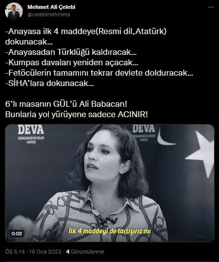 AK Parti İzmir Milletvekili Mehmet Ali Çelebi sosyal medya hesabından bir paylaşım daha yaptı. Çelebi, "6'lı masanın GÜL'ü Ali Babacan! Bunlarla yol yürüyene sadece ACINIR!" dedi. Çelebi, " -Anayasa ilk 4 maddeye(Resmi dil,Atatürk) dokunacak... -Anayasadan Türklüğü kaldıracak... -Kumpas davaları yeniden açacak... -Fetöcülerin tamamını tekrar devlete dolduracak... -SİHA'lara dokunacak..." ifadelerini kullandı.