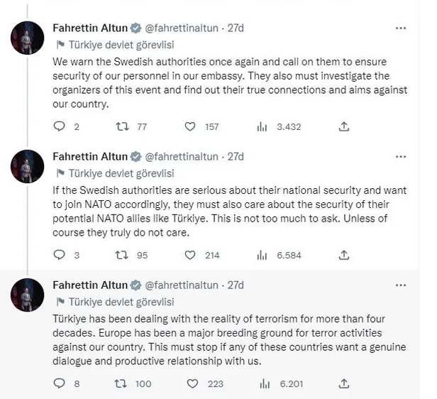 İsveç makamları ulusal güvenlikleri konusunda ciddiyse ve buna istinaden NATO'ya katılmak istiyorlarsa, Türkiye gibi NATO müttefiklerinin güvenliğini de önemsemeleri gerekir.
