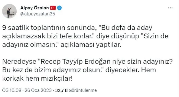 AK Parti İzmir Milletvekili Alpay Özalan, "9 saatlik toplantının sonunda, "Bu defa da aday açıklamazsak bizi tefe korlar." diye düşünüp "Sizin de adayınız olmasın." açıklaması yaptılar. Neredeyse "Recep Tayyip Erdoğan niye sizin adayınız? Bu kez de bizim adayımız olsun." diyecekler. Hem korkak hem mızıkçılar!" ifadelerini kullandı.