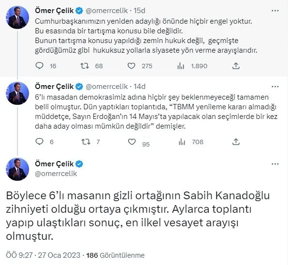 "Cumhurbaşkanımızın yeniden adaylığı önünde hiçbir engel yoktur. Bu esasında bir tartışma konusu bile değildir. Bunun tartışma konusu yapıldığı zemin hukuk değil, geçmişte gördüğümüz gibi hukuksuz yollarla siyasete yön verme arayışlarıdır.