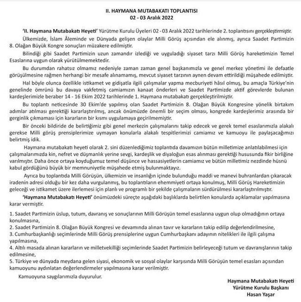 Saadet Partisi'nde 30 Ekim 2022'de yapılan 8. Büyük Olağan Kongre öncesi oluşturulan Haymana Mutabakatı Heyeti, 6'lı masadan çıkacak adayın Milli Görüş'ten olması gerektiğini belirten yeni bir bildiri yayımlanmıştı.