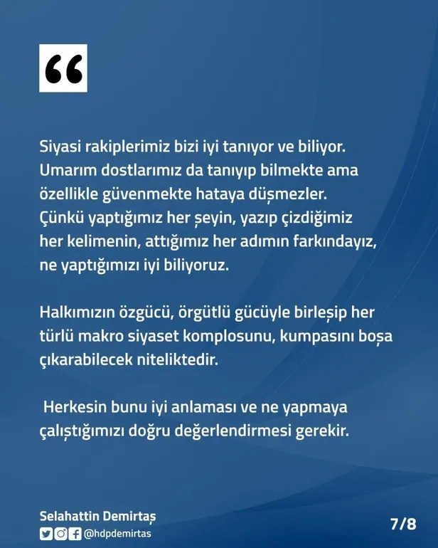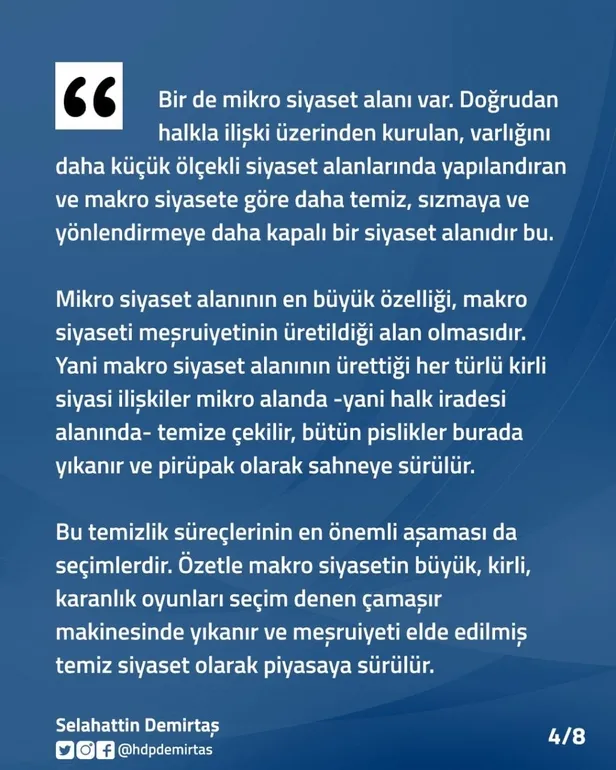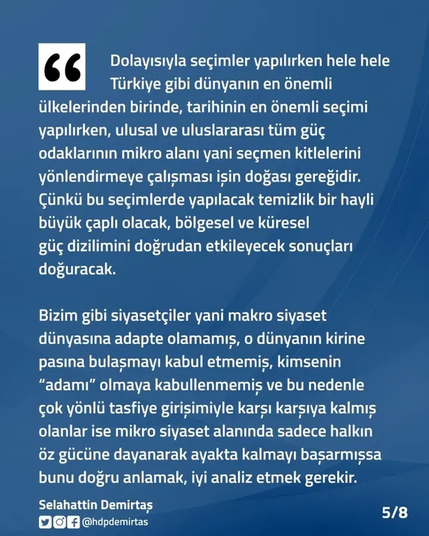 Kılıçdaroğlu'nun grup toplantısına çağırdıktan sonra bir dönem adaylık yarışında kendisini geri çeken İmamoğlu'nun yeniden şehir şehir gezmesine göndermede bulunan Demirtaş, "Bizim gibi siyasetçiler yani makro siyaset dünyasına adapte olamamış, o dünyanın kirine pasına bulaşmayı kabul etmemiş, kimsenin "adamı" olmaya kabullenmemiş ve bu nedenle çok yönlü tasfiye girişimiyle karşı karşıya kalmış olanlar ise mikro siyaset alanında sadece halkın öz gücüne dayanarak ayakta kalmayı başarmışsa bunu doğru anlamak, iyi analiz etmek gerekir." ifadelerini kullandı.