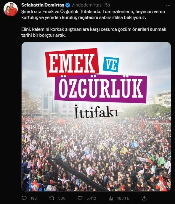6'lı gönderdiği mesajlardan önce Demirtaş, "Şimdi sıra Emek ve Özgürlük İttifakında. Tüm ezilenlerin, heyecan veren kurtuluş ve yeniden kuruluş reçetesini sabırsızlıkla bekliyoruz. Elini, kalemini korkak alıştıranlara karşı cesurca çözüm önerileri sunmak tarihi bir borçtur artık." diyerek kendi ittifakına çağrı yapmıştı.