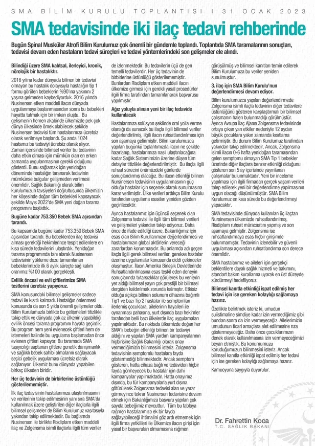 Ayrıca hastalarımız için üçüncü seçenek olan Zolgensma tedavisi ile ilgili tüm bilimsel verileri ve gelişmeleri yakından takip ediyoruz. Daha önce de ifade edildiği üzere, Bakanlığımız için esas olan Bilim Kurullarımızın değerlendirmesi ve hastalarımızın global aktörlerin vereceği zararlardan korunmasıdır. Bu anlamda adı geçen ilaçla ilgili gerek bilimsel veriler, gerekse hastalar üzerine uygulamalar konusunda ciddi çekinceler oluşmuştur. İlacın Amerika Birleşik Devletlerinde Ruhsatlandırılmasına esas teşkil eden deneyin sonuçlarında tutarsızlıklar görülerek bu verilerin yer aldığı bilimsel yayın çok prestijli bir bilimsel dergiden kaldırılmak zorunda kalmıştır. Etkisiz olduğu açıkça bilinen solunum cihazına bağımlı Tip1 ve bazı Tip 2 hastalar ile semptomları ilerlemiş çocuklara, ailelerinin hayalleri ile oynanması pahasına, yurt dışında bazı hekimler tarafından belli bazı ülkelerde ilaç uygulamaları yapılmaktadır. Bu noktada ülkemizde doğan her SMA'lı bebeğin etkinliği bilinen bir tedaviyi aldığını ve yapılan SMA yardım kampanyalarının hiçbirisine Sağlık Bakanlığı olarak onay vermediğimizin bilinmesini isteriz. Zolgensma tedavisinin semptomlu hastalara fayda göstermediği bilinmektedir. Ancak semptom gösteren, hatta cihaza bağlı ve tedaviden hiçbir fayda görmeyecek bu hastalar için dahi kampanyalar yapılmaktadır. Hatta onayımız dışında, bu tür kampanyalarla yurt dışına götürülerek Zolgensma tedavisi alan ve yarar görmeyince tekrar Nusinersen tedavisine devam etmek için Bakanlığımıza başvuru yapılan çok sayıda bebeğimiz mevcuttur.