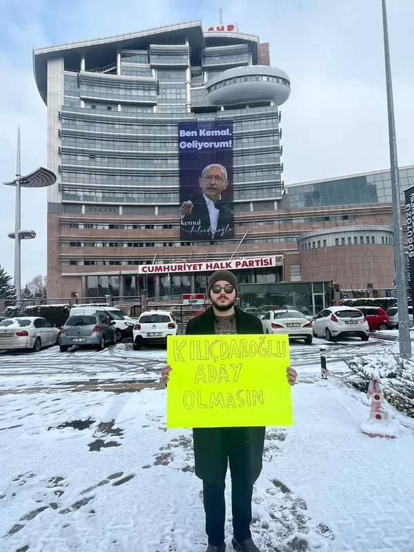 Kılıçdaroğlu'nun "Ben Kemal. Geliyorum" afişinin genel merkeze asılmasının ardından bir vatandaşın karşı hamlesi sosyal medyada gündem oldu. İsminin Emirhan olduğu öğrenilen vatandaş, CHP Genel Merkezi'nin önünde "Kılıçdaroğlu aday olmasın" dövizi açıp poz verdi.