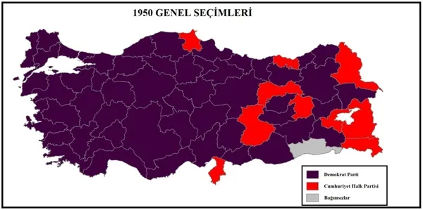 14 Mayıs 1950 seçimlerinde 8 milyon 905 bin 743 seçmenin yüzde 89'u oy kullandı. Katılım oranı çok yüksekti. Oyların yüzde 55.2'sini alan DP seçim sistemi sayesinde meclisteki sandalyelerin yüzde 85'ini kazanmıştı. Demokratlar 487 milletvekilliğinin 416'sını kazandı.