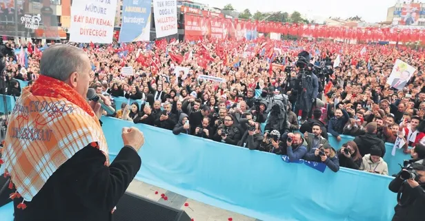 Erdoğan, meydanda toplanan on binlerce vatandaşa, "Aydın, ülkemize diz çöktürmek için yanıp tutuşan küresel vesayetçilere ve maşalarına 14 Mayıs'ta bir kez daha yeter söz milletindir diyor muyuz?" sözleriyle seslendi.