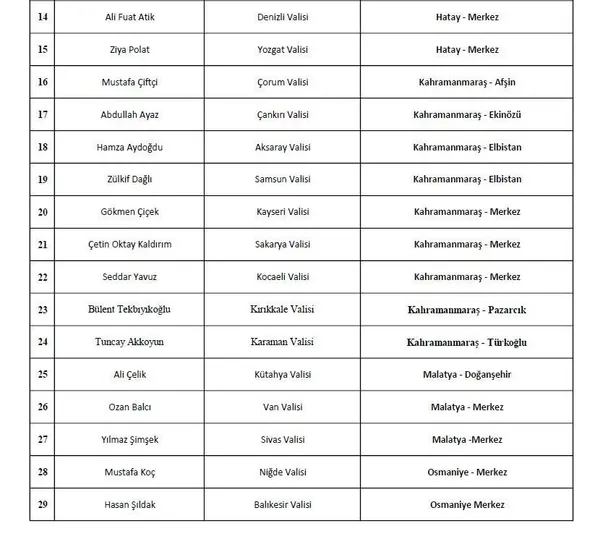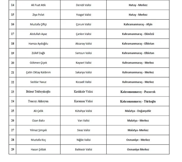 "Depremden etkilenen 10 ilimize mevcut valiliklerimizin yanına onlarla birlikte çalışacak 10 vali daha görevlendirilmiştir. AFAD ve Kızılay gibi doğrudan afet görevi olan kurumlarımız ekiplerini bölgeye göndermişlerdir."