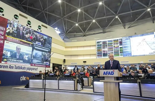 Başkan Erdoğan, merkez üssü Kahramanmaraş'ın Pazarcık ilçesi olan ve 10 ili etkileyen 7,7 büyüklüğündeki depreme ilişkin çalışmaları koordine etmek üzere AFAD Başkanlığına geldi.