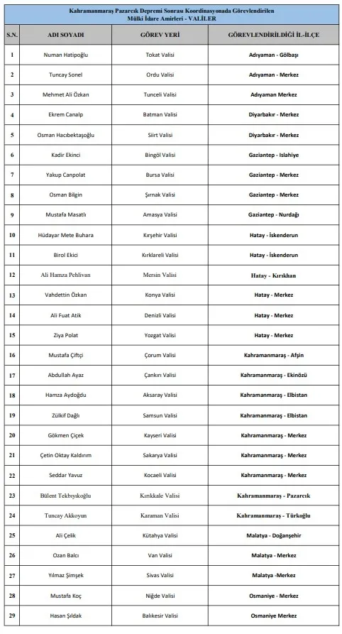 DEPREMİ SONRASI KOORDİNASYONDA GÖREVLENDİRİLEN MÜLKİ İDARE AMİRLERİ.