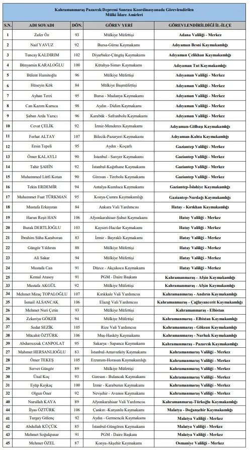 DEPREMİ SONRASI KOORDİNASYONDA GÖREVLENDİRİLEN MÜLKİ İDARE AMİRLERİ.