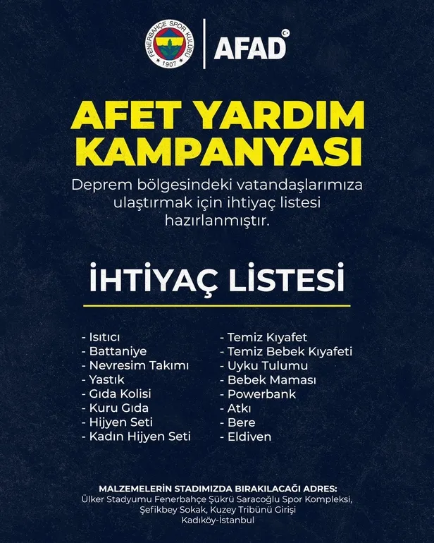"Ülkemizi hüzne boğan deprem felaketinden etkilenen vatandaşlarımız için halkımızın AFAD ihtiyaç listesi kapsamında deprem bölgesine yapmak istedikleri malzeme destekleri için Ülker Stadyumu Fenerbahçe Şükrü Saracoğlu Spor Kompleksi'ni kullanıma açtığımızı, toplanacak tüm malzemeleri Kadıköy Belediyesi ile koordineli olarak afet bölgesine göndereceğimizi halkımızın bilgisine sunuyoruz. Fenerium'dan battaniye, kazak, atkı, bere gibi kışlık malzemeleri afet bölgesine gönderim için hazırlığımızı tamamladığımızı paylaşmak istiyoruz. Bir kez daha Türkiye'mize başsağlığı, yaralanan vatandaşlarımıza acil şifalar, deprem bölgelerindeki tüm arama kurtarma ekiplerine güç ve kuvvet diliyoruz."
