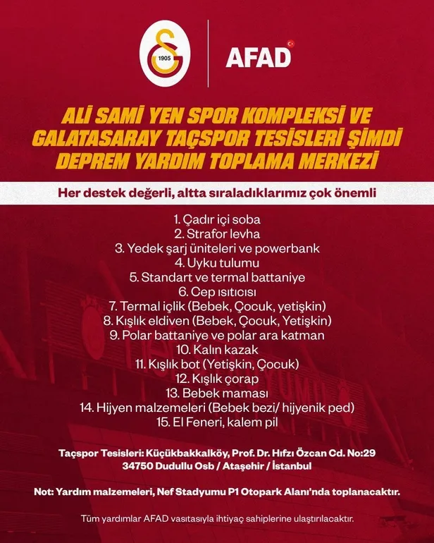 Sarı-kırmızılı kulüpten yapılan açıklamada, AFAD'ın yardım kampanyasına destek olmak üzere belirlenen ürünlerin Nef Stadı ve Taçspor Tesisleri'nde toplanarak depremzedelere ulaştırılacağı belirtildi.