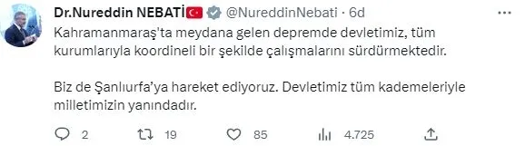 Hazine ve Maliye Bakanı Nureddin Nebati "Kahramanmaraş'ta meydana gelen depremde devletimiz, tüm kurumlarıyla koordineli bir şekilde çalışmalarını sürdürmektedir. Biz de Şanlıurfa'ya hareket ediyoruz. Devletimiz tüm kademeleriyle milletimizin yanındadır" dedi.