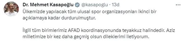 Gençlik ve Spor Bakanı Mehmet Muharrem Kasapoğlu, "Ülkemizde yapılacak tüm ulusal spor organizasyonları ikinci bir açıklamaya kadar durdurulmuştur. İlgili tüm birimlerimiz AFAD koordinasyonunda teyakkuz halindedir. Aziz milletimize bir kez daha geçmiş olsun dileklerimi iletiyorum." dedi.