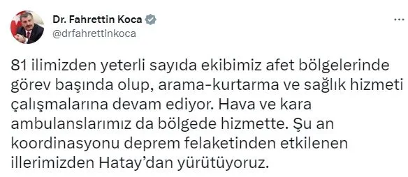 Sağlık Bakanı Fahrettin Koca, "81 ilimizden yeterli sayıda ekibimiz afet bölgelerinde görev başında olup, arama-kurtarma ve sağlık hizmeti çalışmalarına devam ediyor. Hava ve kara ambulanslarımız da bölgede hizmette. Şu an koordinasyonu deprem felaketinden etkilenen illerimizden Hatay'dan yürütüyoruz" şeklinde paylaşımda bulundu.