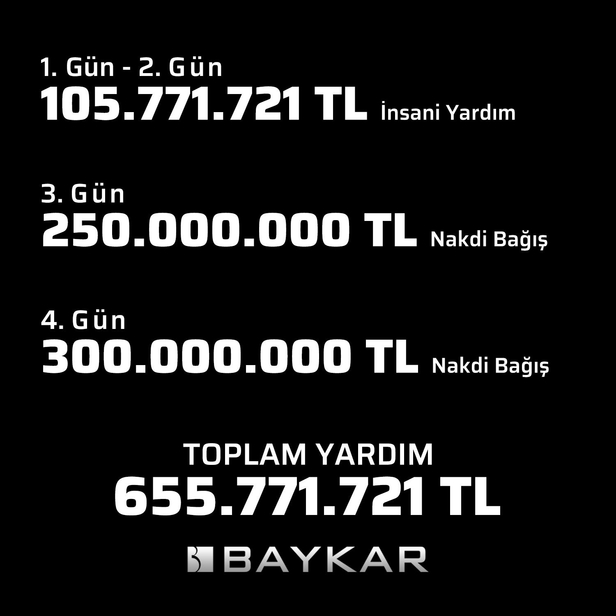 Şirketin açıklamasında "Bugün, kurucumuz merhum Özdemir Bayraktar ve Canan Bayraktar adına, 300 milyon TL'lik bir nakdi yardımı daha AFAD'a ilettik. Baykar ailesi olarak 4 günlük süre zarfında bölgeye gönderdiğimiz insani ve nakdi yardımlar 655 milyon TL'ye ulaştı." ifadeleri yer aldı.
