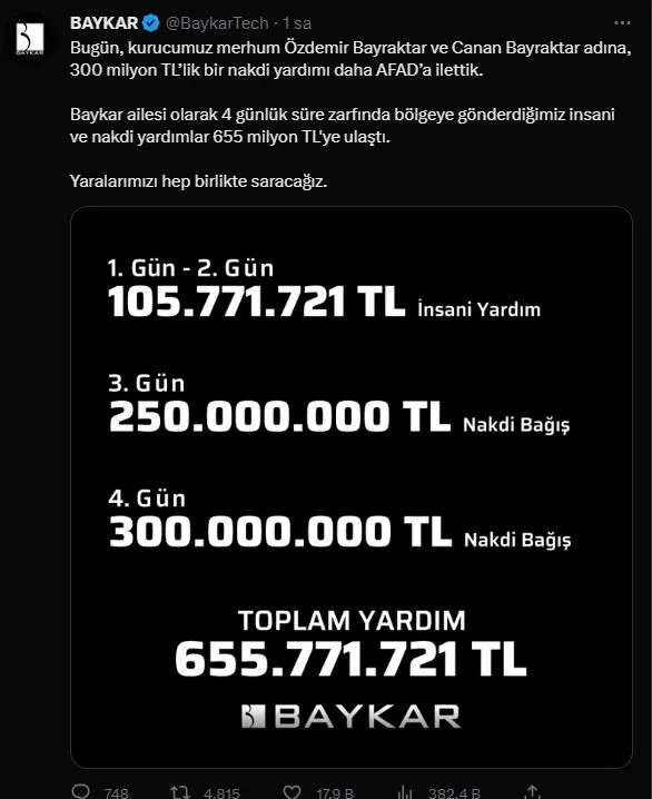 Şirketin açıklamasında "Bugün, kurucumuz merhum Özdemir Bayraktar ve Canan Bayraktar adına, 300 milyon TL'lik bir nakdi yardımı daha AFAD'a ilettik. Baykar ailesi olarak 4 günlük süre zarfında bölgeye gönderdiğimiz insani ve nakdi yardımlar 655 milyon TL'ye ulaştı." ifadeleri yer aldı.