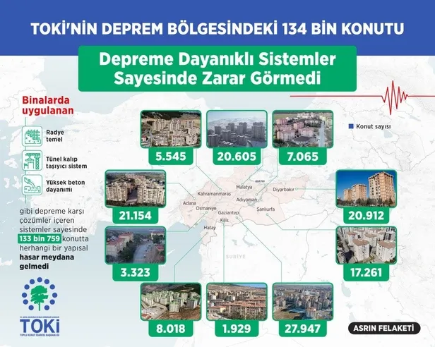 Çevre, Şehircilik ve İklim Değişikliği Bakanlığı Toplu Konut İdaresi Başkanlığınca (TOKİ), Kahramanmaraş merkezli depremin yaşandığı 10 ilde inşa edilen 133 bin 759 konutun, depremlerden yapısal hasar görmediğini duyurdu.