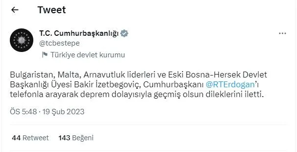 Bulgaristan, Malta, Arnavutluk liderleri ve Eski Bosna-Hersek Devlet Başkanlığı Üyesi Bakir İzetbegoviç, Cumhurbaşkanı Recep Tayyip Erdoğan'ı telefonla arayarak deprem dolayısıyla geçmiş olsun dileklerini iletti.