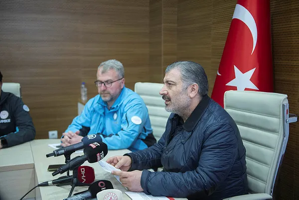 Halk sağlığının korunması ve salgın hastalıkların önlenmesi için çalışmaların devam ettiğini belirten Bakan Koca, "Bakanlık olarak, afetten etkilenen şehirlerde, şu aşamada, en özellikli görevimiz, halk sağlığını tehdit edebilecek şartlara karşı mücadele etmek, bulaşıcı hastalıkların önüne geçmek, hastaları hızla tedavi etmektir. Afet bölgesinde muhtemel bulaşıcı hastalıklarla ilgili riskler, sürveyans erken uyarı sisteminin kurulmasıyla kontrol altında görünmektedir. Afetin ilk gününden itibaren, bölgede 12 bin 27 noktada bakiye klor ölçümü yapılmış, 2.029 noktada bakiye klor oranı yetersiz bulunmuştur. 4 bin 971 numune ile su analizi yapılmış, örneklerin yüzde 18,5'i uygunsuz bulunmuştur. Halen su süper klorlaması yapılmaktadır. Çevre sağlığının korunması için çöplerin toplanması, enkaz alanlarına kireçleme yapılması, hayvan leşlerinin ilaçlanarak gömülmesi ve diğer tüm tedbirler titizlikle yürütülmektedir. Afet bölgesinde halen 19 bin 109'u hekim, 67 bin 512'si sağlık personeli ve 36 bin 901'i diğer personel olmak üzere 123 bin 522 kişiyle hizmet vermekteyiz. Bu personelle birlikte 4 bin 584 UMKE, 6 bin 60 ambulans personelimiz bulunmaktadır. 112 ambulans sayımız bin267, UMKE araç sayımız 245'tir. UMKE ekiplerimizin bir bölümü gezici sağlık hizmeti vermekte, kronik hastalara ilaçlarını ulaştırmaktadır. Gezici sağlık hizmetleri çerçevesinde Kahramanmaraş, Hatay, Malatya ve Adıyaman'ın 76 ilçesi ve 1 bin 512 köyüne, 50 bini aşkın hastaya sağlık hizmeti götürdük. Afet bölgesinde ilki Adana'da, ikincisi Gaziantep'te olmak üzere 2 yerde bölge ilaç ve tıbbi sarf lojistik deposu oluşturduk. Diyarbakır, Şanlıurfa, Hatay ve Adıyaman ilaç ve tıbbi sarf lojistik depolarımız hizmettedir. Birinci basamak sağlık hizmetlerimizi, kapasite ve genişlik olarak, güçlendiriyoruz. 184 Deprem Sağlık Hattını kurduk. Afetten en çok zarar gören üç ilimizde 75 yaşından büyük vatandaşlarımızı ve kronik hastalarımızı belirlemeye başladık. Evde sağlık ekiplerimiz ve mobil sağlık timlerimizle, bu hastalarımıza, evine giderek veya nerede bulunuyorsa oraya ulaşarak ilacını verip, sağlık hizmeti ihtiyacını karşılıyoruz" şeklinde konuştu.