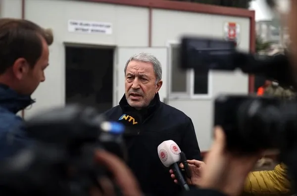 Milli Savunma Bakanı Hulusi Akar, Kahramanmaraş merkezli depremlere ilişkin açıklamalarda bulundu. Bakan Akar'ın salksız olduğu görüldüü.